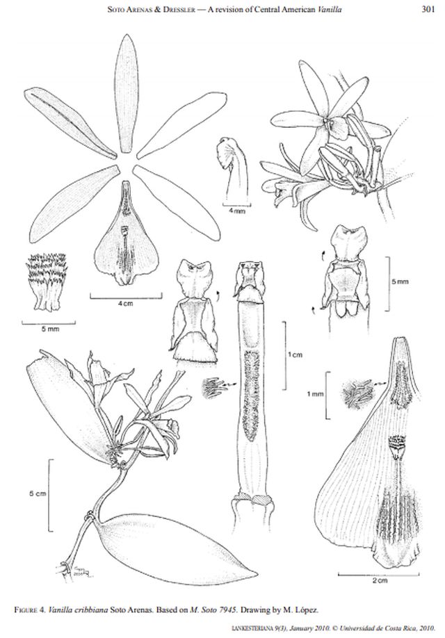 "Vanilla cribbiana is a member of the V. hostmanii group. Its fruits are fragrant, and probably of some interest, but the vine is not a strong grower and does not produce fruits regularly." Soto Arenas & Cribb 2010