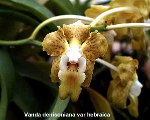 References W3 Tropicos, Kew Monocot list , IPNI ; Otia Botanica Hamburgensia Rchb.f 1878; The Orchids of Burma Grant 1895/95; Die Orchideen Schlechter 1915 photo fide; Atlas des Orchidees Cultivees Constantin 1920 as V dennisoniana var hebraica drawing fide; The Orchids of Thailand Seidenfaden & Smitinand 1963 drawing photo fide; Encyclopedia of Cultivated Orchids Hawkes 1965; Beautiful Thai Orchid Species Kamemoto & Sagarik 1975 photo fide; AOS Bulletin Vol 47 No 6 1978 photo fide; Rudolf Schlechter Die Orchideen Band 1B lieferung 19/20 1129 - 1264 Brieger 1988 photo fide; Die Orchideen lieferung 19/20 Schlechter/Brieger 1988 as V dennisoniana var hebraica; Opera Botanica #95 Seidenfaden 1988 drawing/photo fide; Thai Orchid Species Rakpaibulsombat 1992 photo fide; Identification of the Orchids [Orchidaceae Juss.] Vietnam Averyanov 1994; Orchid Digest Vol 61 #2 1997 photo fide; Vandas Motes 1997 photo fide; AOS Bulletin Vol 67 No 9 1998 photo fide; AOS Bulletin Vol 68 No 2 1999 photo fide; AOS Bulletin Vol 70 No 3 2001 photo fide; Rudolf Schlechter Die Orchideen Band 1C lieferung 42 - 43 pg 2626 - 2762 Brieger 2001; A field Guide to the Wild Orchids of Thailand Vaddhanaphuti 2001 photo fide; AOS Bulletin Vol 72 No 8 2003 photo fide; AOS Bulletin Vol 72 # 11 2003 photo fide; AOS Bulletin Vol 74 No 9 2005 photo fide; A field Guide to the Wild Orchids of Thailand Vaddhanaphuti 2005 photo fide; AOS Bulletin Vol 75 No 1 2006 photo fide; Wild Orchids in Myanamar Vol 3 Tanaka 2007; AOS Bulletin Vol 79 #2 2010 photo fide; AOS Bulletin vol 78 No 12 2009 photo fide; A to Z of South East Asian Orchid Species Vol 2 O'Byrne 2011 photo fide; The Wild Orchids of Myanmar Taunggyi 2014 photo fide; Orchid Digest Vol 80 #2 2016; Turczaninowia 19 (3): 5–58 L. V. Averyanov, Khang Sinh Nguyen etal 2016 ; AOS Bulletin Vol 89 #2 2020 photo fide
