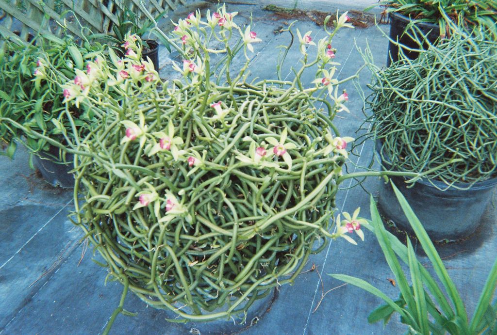 Found in Florida, Puerto Rico, Haiti, Dominican Republic, Leeward Islands and Cuba in moist serpentine scrub forests at elevations of 150 to 750 meters as a giant sized, hot to warm growing terrestro-epiphyte with scandent, thick, 8" [20 cm] long internodes, smooth stems carrying fleshy, triangular-lanceolate, somewhat involute, apically hooked, acute, conduplicate, small, bract-like leaves that blooms in the late spring on an axillary, short, several to 8 flowered inflorescence with fleshy broadly ovate, small floral bracts and carrying successively opening, large, showy, ephemeral, fragrant flowers.