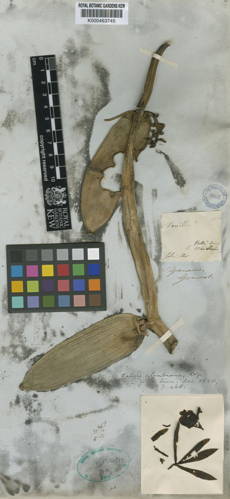 Vanilla columbiana Rolfe 1896 SUBGENUS Xanata SECTION Xanata Collection Sheet by © Goudot and The Kew Herbaria Website