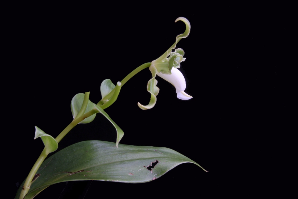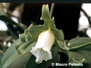 Found in Sao Paulo state of Brazil as well as northern Argentina at elevations around 150 to 800 meters in dwarf scrub forest as a medium to giant sized, cool to warm growing epiphyte with an ascending stem with the basal portion in the ground with leaf detrius and carrying coriaceous, thin, pendent, dark yellowish green leaves that blooms in the late spring and early summer on an axillary, 6" [15 cm] long, 1 to 4 flowered inflorescence.