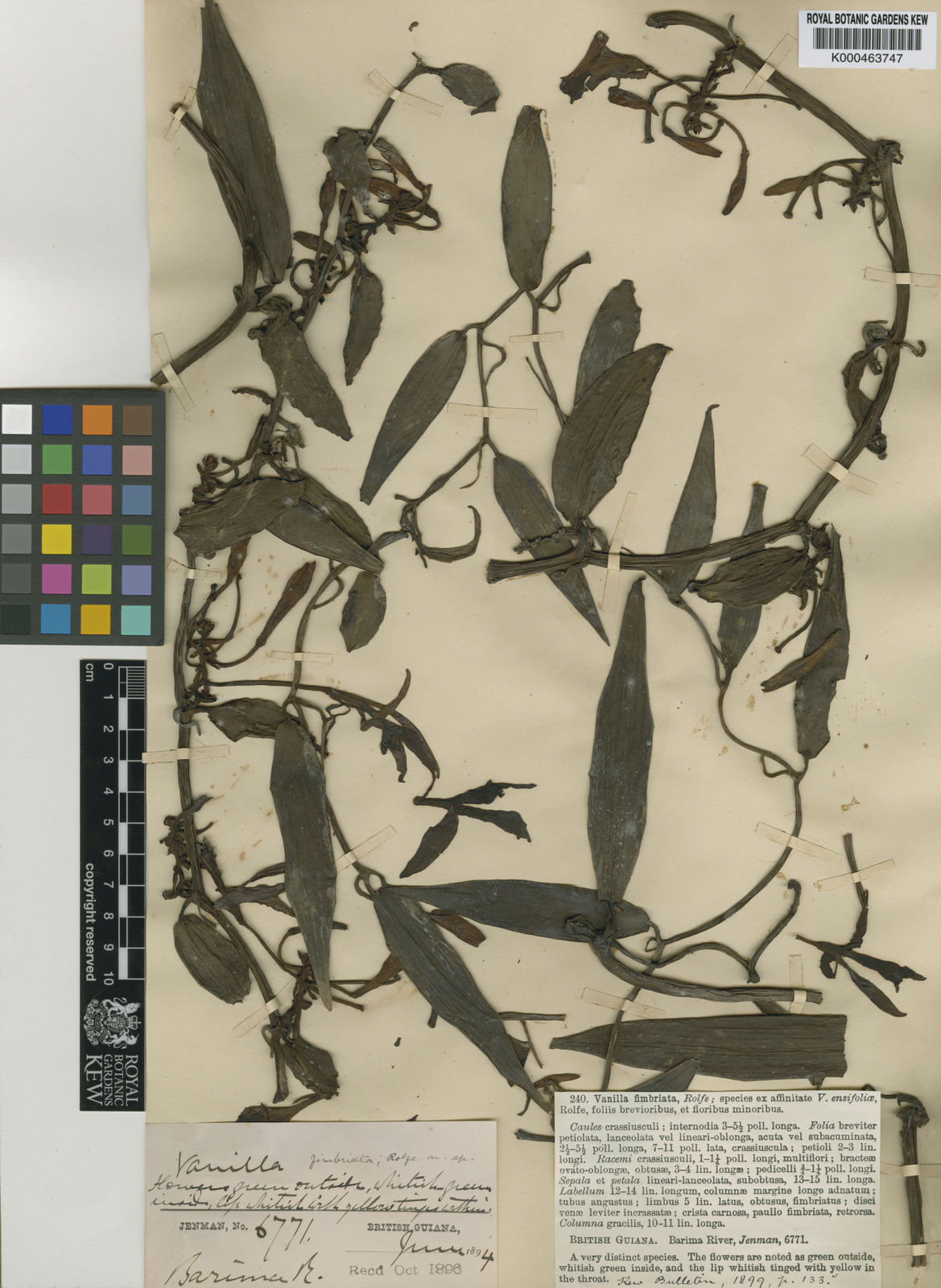 Vanilla fimbriata Rolfe 1899 SUBGENUS Xanata SECTION Xanata Collection Sheet by © Jenman