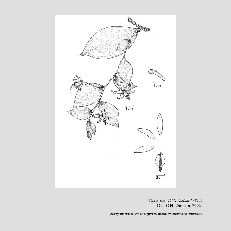 Found in El Oro province of Ecuador at elevations around 1000 meters as a large sized, warm growing viney epiphyte with scandent, thick, robust stems carrying elliptic to oblong-elliptic, acute to apiculate, fleshy, pendulous leaves that blooms in the spring on a to 18" [45 cm] long inflorescence, similar to the vegetative stems but with a flower in each axil of the leaf-like floral bracts and carrying green flowers with a white lip.
