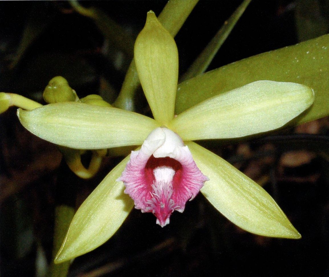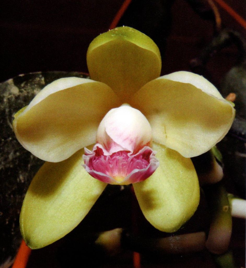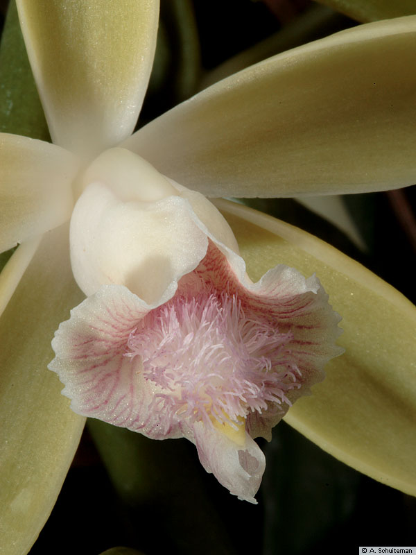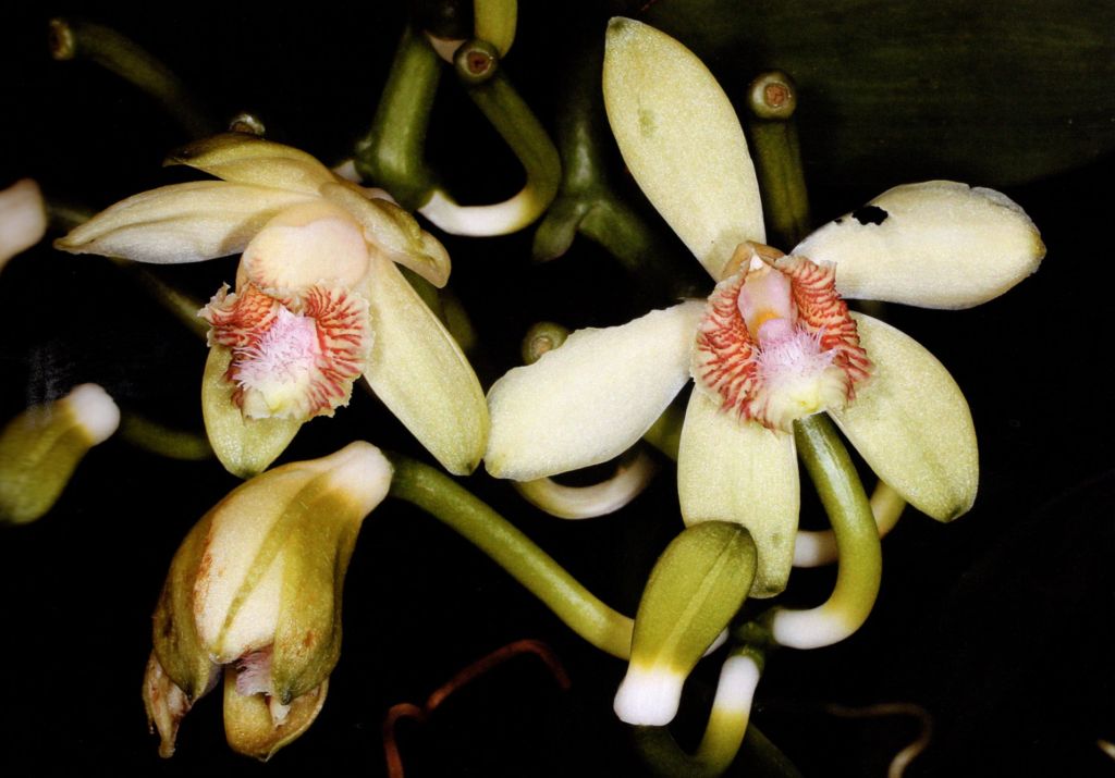 Found in Assam, Thailand, Malaysia and Borneo in dry evergreen hill forests on sandstone at elevations of sea level to 1000 meters as a large sized, hot to warm growing epiphyte with an elongate, terete climbing stem carrying short stalked leaves that have an abrupt narrow tip blooming in the winter and earlier spring on a 1.2 to 2.8" [3 to 7 cm] long, to 6 flowered inflorescence with speading bracts and carrying fragrant flowers.