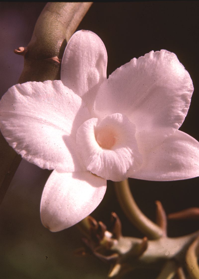 "This leafless vanilla has spectacular white flowers with an apricot or pale pink throat to the lip, petals which are very broad and a lip with a somewhat undulate margin. It is very closely related to V. madagascariensis> and V. phalaenopsis from the Seychelles; if they are considered conspecific, the correct name for the species is V. phalaenopsis, the oldest epithet. Vanilla roscheri is common in tropical deciduous coastal forests of Kenya and Tanzania, and it is occasionally cultivated as ornamental. It has been only recently recorded from near Lake Sibaya in South Africa."