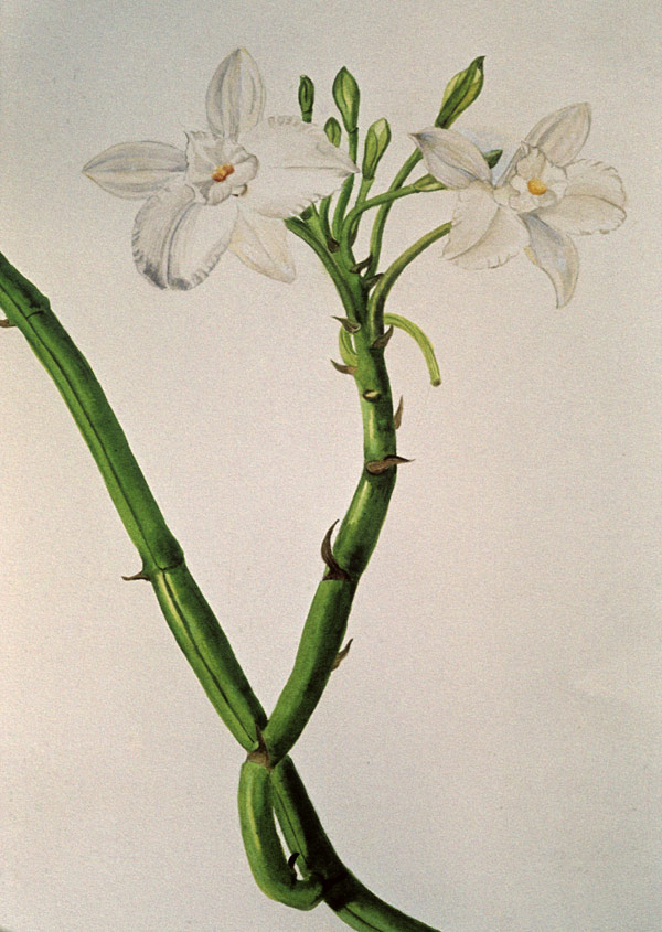 Found in southern India and Sri Lanka in dry scrub on trees and bushes at elevations around 600 meters as a large sized, hot to warm growing, viney epiphyte with a vertically grooved on one face, leafless, very stout stem that blooms in the spring on a terminal, very stout, 4 to 6" [10 to 15 cm] long, successively many flowered inflorescence with broadly ovate, subacute, 5 to 7 veined floral bracts and carrying white flowers.