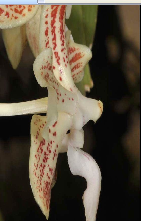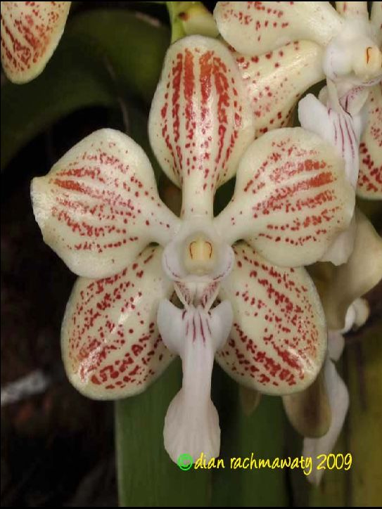 Found in Sulawesi on scrub trees in high grassy valleys at elevations around 1200 meters as a large sized, warm to cool growing epiphtye with an erect, occasionally basally branching stem carrying many, crowded, basally overlapping, strap shaped, sharply keeled beneath, unequally bilobed apically, with a short mucro between leaves that blooms in the late spring and early summer on an axillary, arching, cream colored, 6.4 to 8.4" [16 to 21 cm] long, 5 to 8, loosely flowered inflorescence and carrying fragrant, rather thick and fleshy flowers