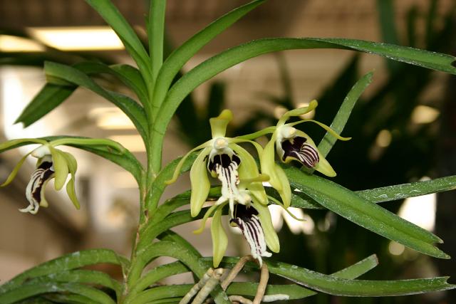 Found in Myanmar at elevations of 1200 to 1500 meters as a medium sized, cool growing epiphyte with an erect stem carrying ligulate, arching, praemorse, unequally acutely bilobed apically leaves that blooms in the spring on an axillary, short to .6" [1.5 cm] long, 1 to 2 flowered inflorescence with ovate floral bracts