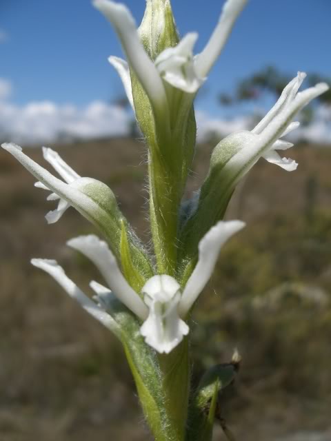 Found in Bahia Brazil as a medium sized, cool growing terrestrial with a single basal, straight, linear, acute, attenuate below into the petiolate base leaf that blooms in the late spring on a terminal, erect, sparsely villose, to 16" [to 40 cm] long, rachis 2.4" [6 cm] long, more or less aggregate at the apex, 4 to 10 flowered inflorescence with lanceolate, acuminate, slightly longer than the ovary floral bract.