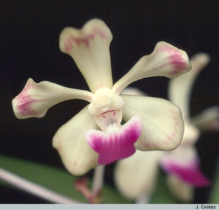Found in the Philippines at elevations around 1250 meters as a giant sized, cool growing, monopodial epiphyte with an elongate, erect stem carrying many alternate, gracefully curved leaves that are unequally bilobed apically and blooms in the fall on a horizontal to pendulous, longer than the leaves, several to many [to 12] flowered inflorescence carrying fragrant flowers.