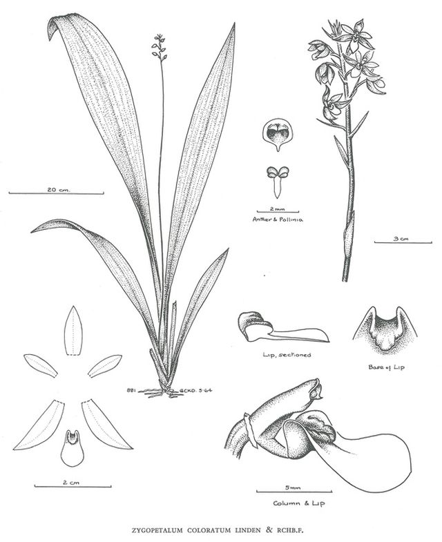 References W3 Tropicos, Kew Monocot list , IPNI ; Venezuelan Orchids Illustrated Vol 3 Dunsterville and Garay 1965 as Zygopetalum coloratum drawing fide; Flora de Venezuela Volumen 15 Parte Quarto Foldats 1970 as Z coloratum drawing fide; Rudolf Schlechter Die Orchideen Band 1B lieferung 27 1648 - 1712 Brieger 1993
