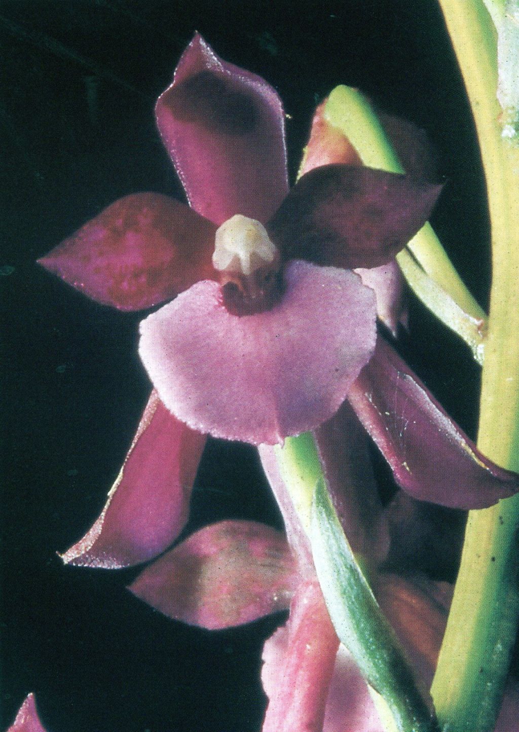 Found in Colombia, Venezuela and Ecuador as a terrestrial orchid with fairly slender, lightly compressed, cylindrical, pseudobulbs completely enveloped by very persistent, leaf sheaths carrying plicate, lanceolate, acute, narrowing below into the atteneuate base leaves that blooms on a basal, erect, dark maroon puce, green bracted, to 32" [80 cm] long, rachis, short, several flowered inflorescence with narrow, long floral bracts and carrying flowers with yellow, somewhat pink flushed dorsally petals and sepals and a pure white lip that becomes light red with age