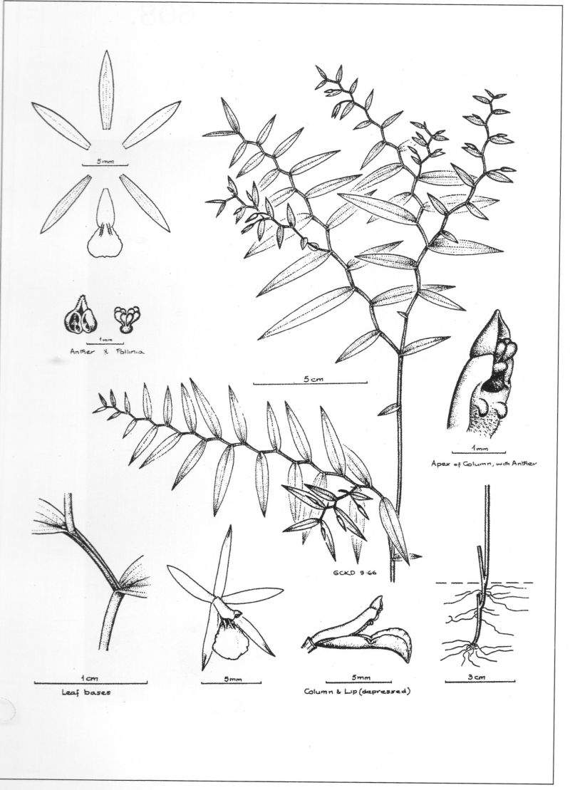 Found in French Guiana, Guyana, Venezuela, Ecuador, Peru, Bolivia and Brazil at elevations around sea level to 1000 meters as a small sized, hot to warm growing terrestrial with soft roots, erect cane-like stems carrying flat, distichous, lanceolate, acute to acuminate, plicate leaves decreasing above in size into the floral bracts that blooms in the later spring on axillary, single flowered inflorescence.