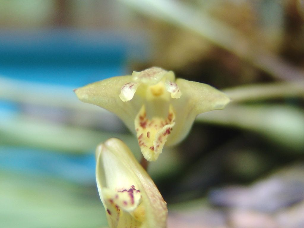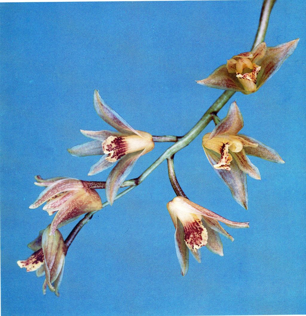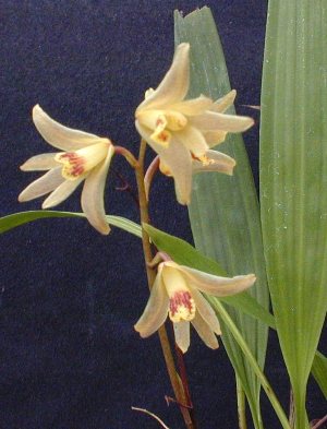 Found in Colombia and Venezuela in wet premontane forests at elevations around 1600 to 1800 meters as a small to medium sized, cool growing epiphyte with ovoid to narrowly ovoid, slighly compressed pseudobulbs enveloped basally by evanescent sheaths and carrying a single, apical, erect, plicate, lanceolate, acute, gradually narrowing below into the elongate, petiolate base leaf that blooms in the later winter and again in the early summer on a basal, erect to ascending, racemose, 5" [12.5 cm] long, few flowered inflorescence carrying fragrant flowers