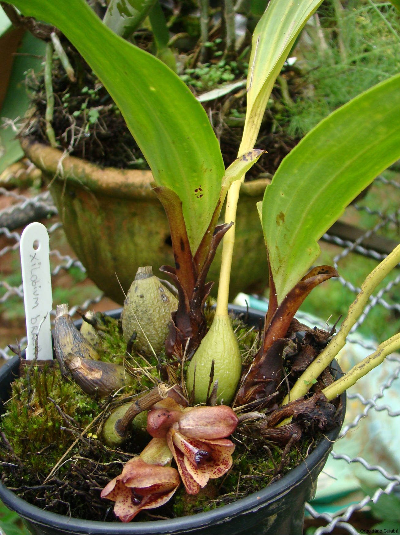 Found in Belize, Guatemala, Nicaragua, Panama, Costa Rica, Trinidad & Tobago, French Guiana, Surinam, Guyana, Venezuela and Brazil as a medium sized, hot to warm growing, caespitose epiphytic orchid occurring in lowland rainforest and riverine areas at altitudes of 200 to 1000 meters with nearly spherical, smooth pseudobulbs subtended by evanescent, nonfoliaceous sheaths and has 2 apical, obovate, obtuse, thick, grey-green, gradually narrowing below into the conduplicate petiolate base leaves that are heavily veined on the underside and blooms in the winter and spring on a basal, 3/4" [2 cm] long, densely 8 to 10 flowered, bracteate, subcapitate racemose inflorescence, arising on newly maturing and mature pseudobulb, that is shorter than the pseudobulb and has mild, agreeable fruity scented flowers.