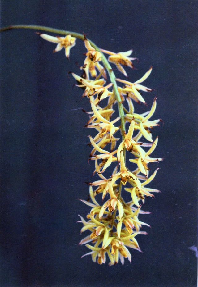 Found in El Oro Province of Ecuador in seasonally dry montane cloud forests at elevations around 1300 meters as a small sized, warm to cool growing epiphyte with stout, ovoid to subconic, tapering, smooth to somewhat ridged pseudobulbs enveloped basally by 2 to 3, brown, fibrous, imbricating bracts and carrying 2 to 3, apical, erect, subcoriaceous, plicate, strongly veined, elliptic, acute, gradually narrowing below into the petiolate base leaves that blooms in the spring on a basal, nodding to pendent, to 16" [40 cm] long, many flowered inflorescence with 3, acuminate bracts on the peduncle and short, triangular floral bracts .