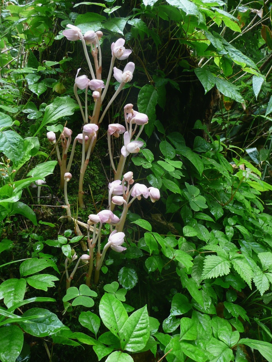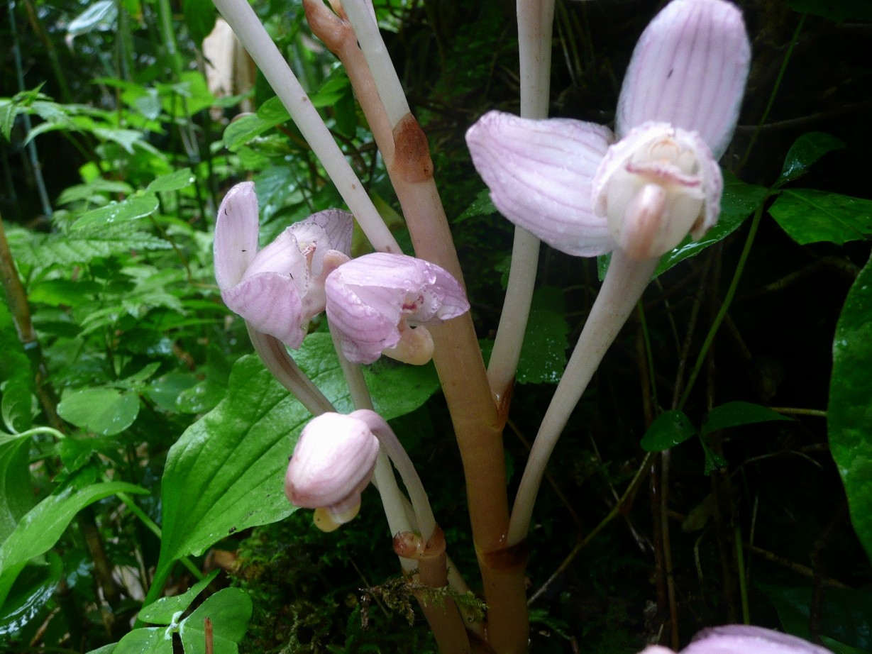 Found in the Chinese Himalayas, Assam, Taiwan and Japan in montane forests and bamboo grasslands as a small sized, cool growing, leafless terrestrial with a subterranean, branching, soft, fleshy, tuberculate rhizome giving rise in the summer to a terminal, from the end of the rhizome, erect, to 6" [to 15 cm] long, 3 to 6 flowered, inflorescence.