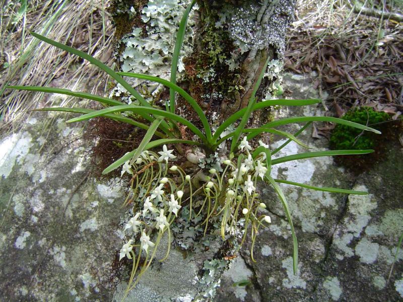 Found in Tanzania, Malawi, Mozambique, Zambia, Zimbabwe and Cape and Natal states of South Africa in high rainfall woodlands at elevations of 1000 to 2100 meters as a miniature sized, warm to cold growing epiphyte or lithophyte with a short, erect stem carrying 4 to 5, fan-shaped, linear, folded, slightly recurved leaves that blooms in the fall on a basally arising, erect to arching, 2 to 8" [5 to 20 cm] long, 12 to 20 flowered inflorescence