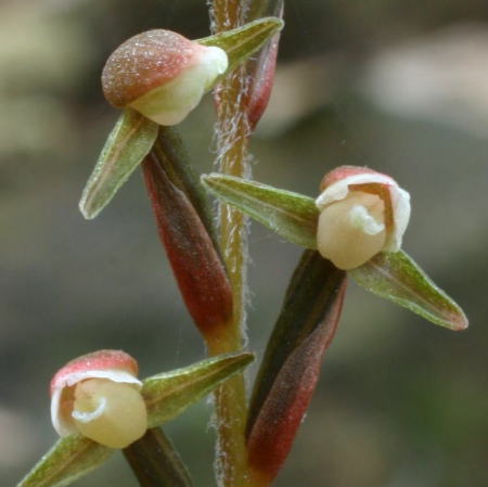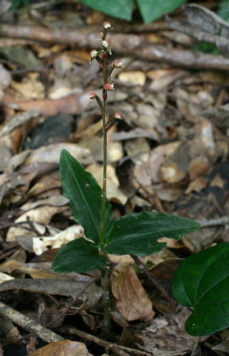 Found in Japan, Ryukyu Islands and Taiwan in shady areas of broad-leaved forests at elevations around 900 meters as a miniature sized, cold growing terrestrial with a suberect rhizome giving rise to an erect to ascending stem carrying narrowly ovate-lanceolate to ovate-elliptic, acute, subrounded at the base and contracted into a long petiolate base leaves that blooms in the late summer and early fall on an erect, rather slender, laxly few flowered inflorescence with ovate-lanceolate, shorter than the ovaries floral bracts.