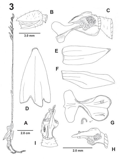 Zeuxine eryliae Ormerod 2018 A, plant; B, flower; C, flower minus tepals; D, dorsal sepal; E, lateral sepal; F, petal; G, labellum; I, H, column, lateral and ventral
