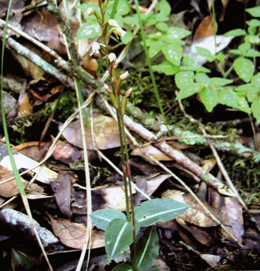 Found in the western Guangxi and southeastern Yunnan proivinces of China, Assam, the eastern Himalayas, Nepal, Myanmar and Vietnam in deep forests at elevations around 1800 to 3100 meters as a miniature to small sized, cool to cold growing terrestrial with a stem with distant clasping sheaths and carrying 2 to 4, oblong-ovate, acute, velvety green with a pure white mid-rib, shortly petiolate base leaves that blooms in the summer through earlier fall on a ridged, peduncle 3.2 to 7.4" [8 to 18.5 cm] long, provided with 1 to 2, linear-lanceolate bracts, sparsely pubescent, 4 to 8.4" [10 to 21 cm] long, laxly 3 to 15 flowered inflorescence and ovate, acuminate, equaling the ovary in length floral bracts.