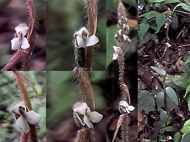 Found in Assam, Arunchal Pradesh and Kerala India, Thailand, penninsular Malaysia and Java at elevations of 80 to 700 meters in lowland rubber estates and in open places as a miniature to small sized, hot to warm growing terrestrial orchid with 6, lanceolate, shiny green, acute, abruptly narrowing below into the very short, stalked leaves that blooms in the early spring on a slender, pubescent, 2 to 3 bracted, 10" [25 cm] long, several flowered inflorescence with successive opening flowers.