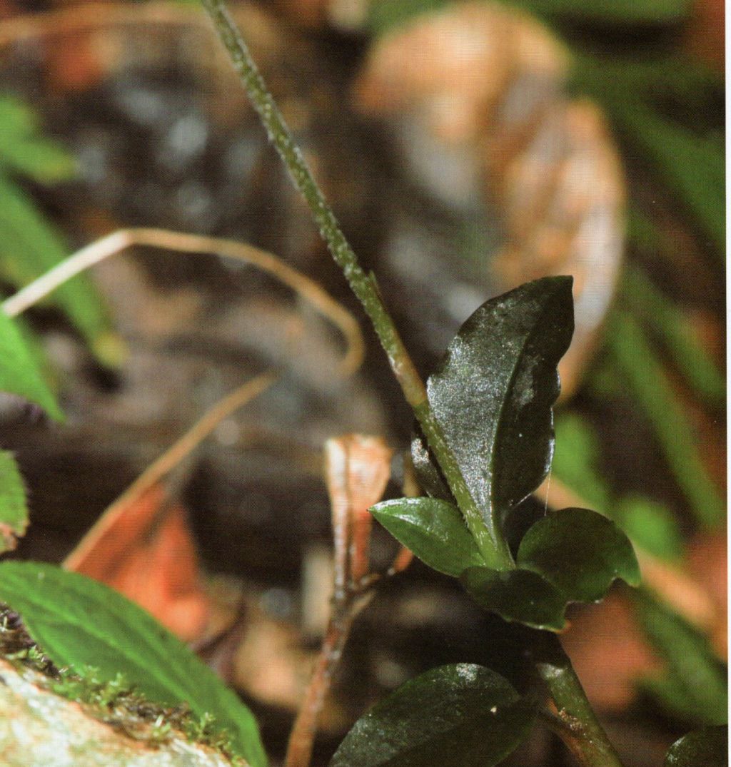 Found in Hainan province of China at elevations of 200 to 1650 meters as a small sized, hot to cool growing terrestrial with ovoid, concolor, clasping leavves that blooms in the late summer and early fall on on an erect, terminal, to 3.8" [9.5 cm] long, pubescent, 4 to 6 flowered inflorescence with shorter than the pedicel, oblong-lanceolate floral bracts .