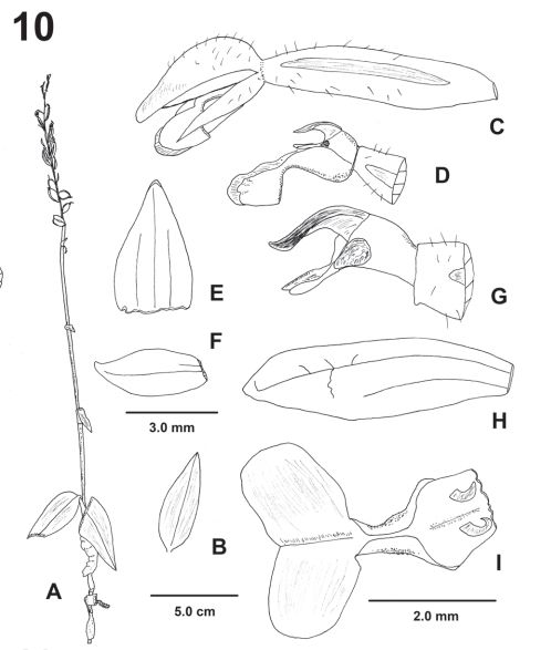 Zeuxine pseudogracilis Ormerod 2018 A, plant; B, leaf; C, flower; D, flower minus tepals; E, dorsal sepal; F, lateral sepal; G, column; H, petal; I, labellum.