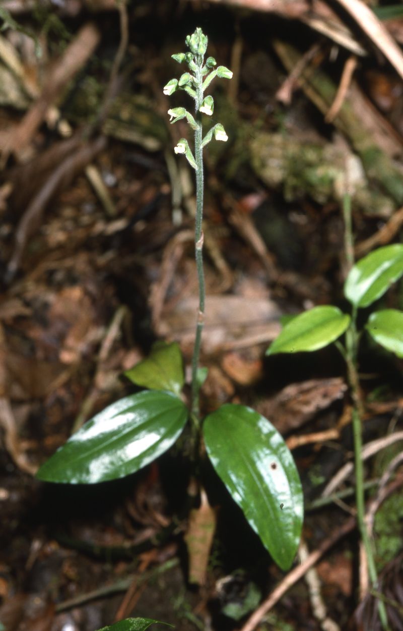 Found in Fiji, Samoa, Tonga and Vanuatu in dense forests at elevations of 150 to 750 meters as a small to medium sized, hot to warm growing terrestrial with shiny green, lanceolate, acute leaves that blooms on a terminal, erect, sparsely hairy, laxly many flowered inflorescence with lanceolate, acuminate floral bracts.