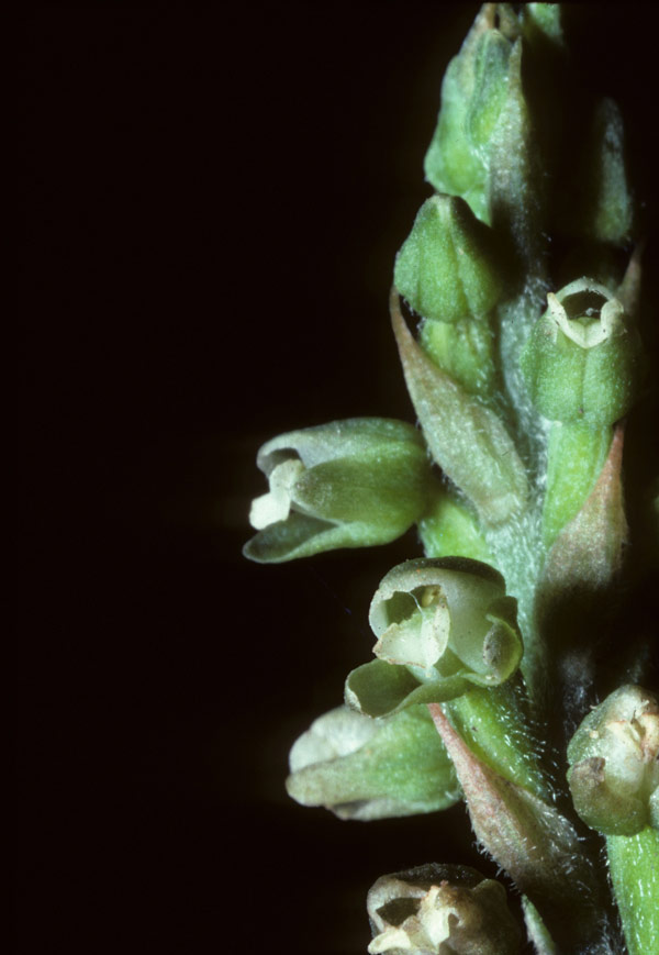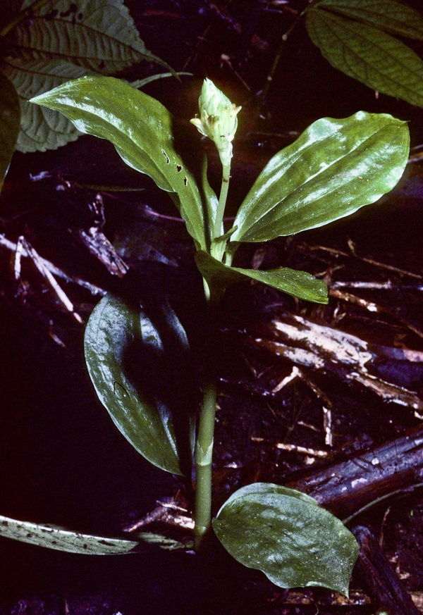 Found in Java, Borneo and Sulawesi at elevations of 350 to 950 meters as a small sized, hot to warm growing terrestrial with an erect stem carrying 3 to 4, broadly lanceolate, dark green, shiny, 3 main veined leaves that blooms in the later winter and early spring on a short hairy, to 3.6" [to 9 cm] long, to 15 flowered inflorescence carrying scarcely opening flowers with chlorophyll green colored sepals and ovaries which is distinctive amongst the Javanese species of Zeuxine.