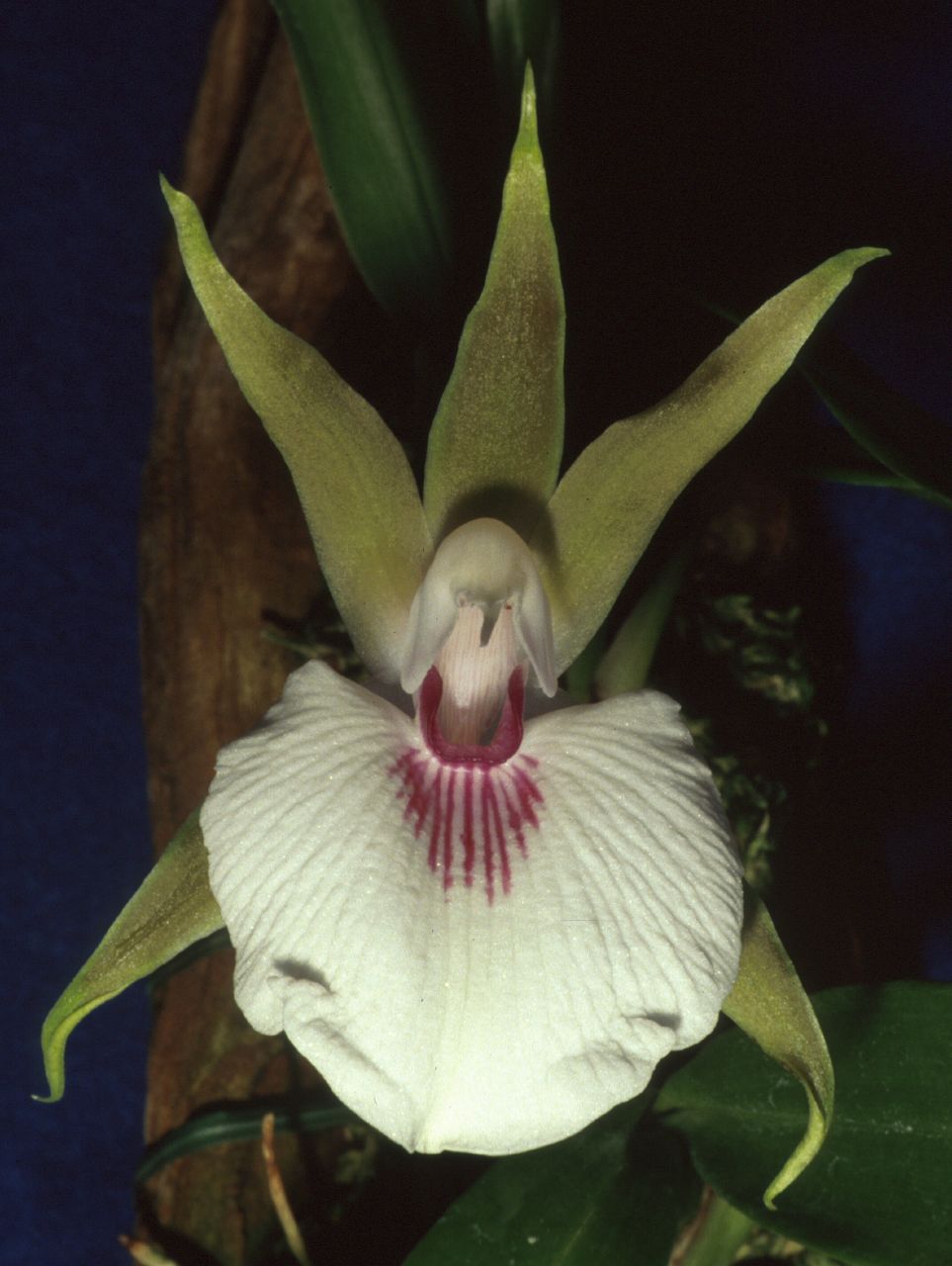 Found in French Guiana, Surinam, Guyana, Venezuela, Colombia, Ecuador, Peru and Brazil as a medium sized, hot to warm growing, climbing epiphyte in wet montane forests at elevations below 1200 meters with a remote, oblong to ovate-pyriform, complanate pseudobulb with 2 to 3, basal pairs of distichous, imbricate sheaths with the uppermost being leaf bearing and 2 apical, oblanceolate, acuminate, plicate, conduplicate and imbricate at the short, petiolate base, subcoriaceous, carinate mid-vein, dark green leaves that blooms in the spring and early summer on an erect, 8" [20 cm] long, 1 to 3 flowered, bracteate inflorescence with large, fragrant, long-lasting, simultaneously opening flowers arising on a mature pseudobulb and held below the leaves, with lanceolate, acuminate bracts.