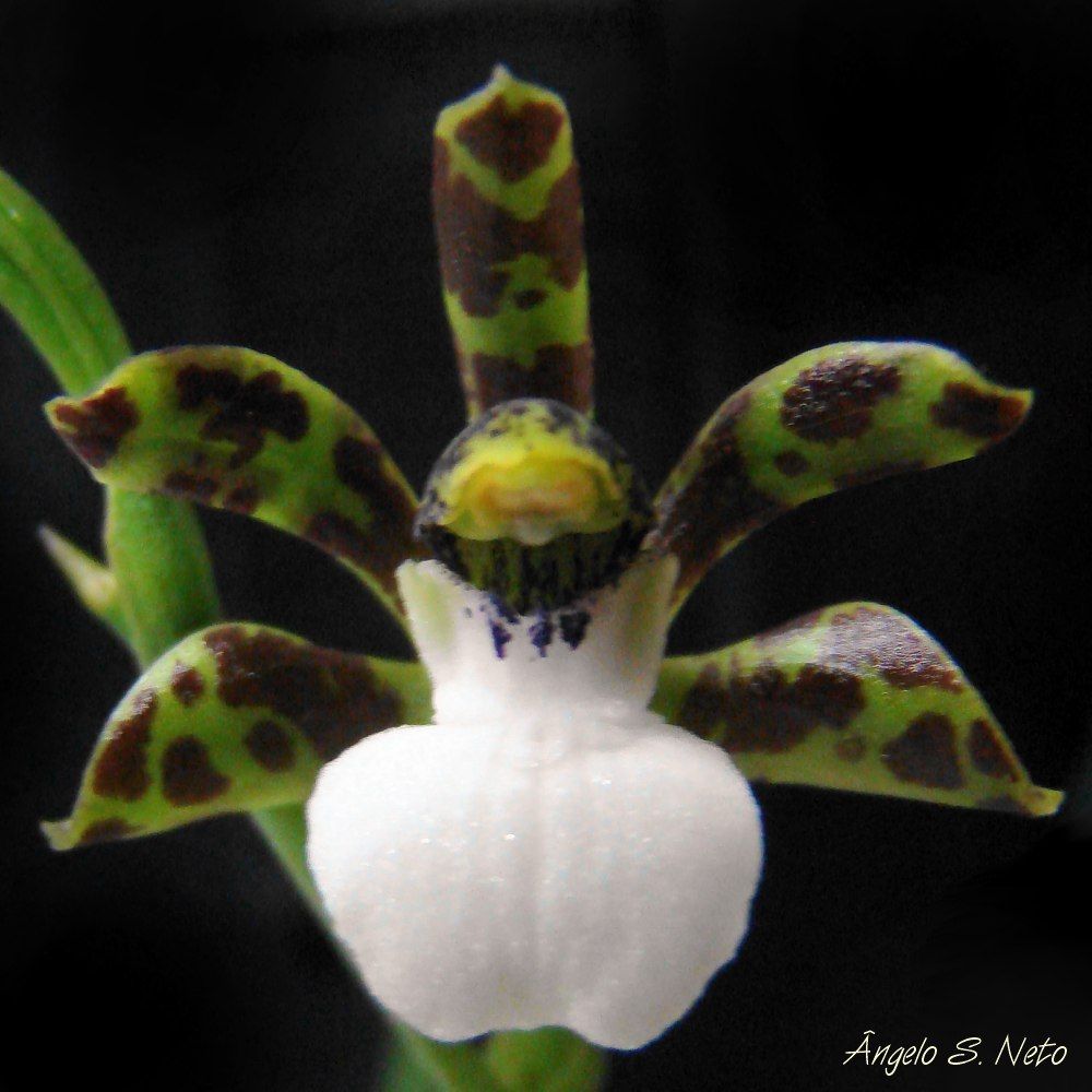Found in southeastern Brazil as a small sized, cool growing terrestrial with, small, aggregate, erect to erect-patent, ovoid-oblong pseudobulbs carrying 2, rarely 1, apical, proportionally small, coriaceous, linear-lanceolate, acute, plicate, 3-nerved, attenuate and conduplicate below into the base leaves that blooms on an erect, much longer than the leaves, 6 to 10" [15 to 25 cm] long, 2 to 5 flowered inflorescence with a few, well spaced, strongly adpressed to the scape, ovate, acute bracts and coriaceous, ovate-triangular, acute, shorter than the ovary floral bracts