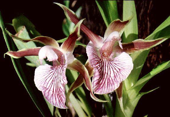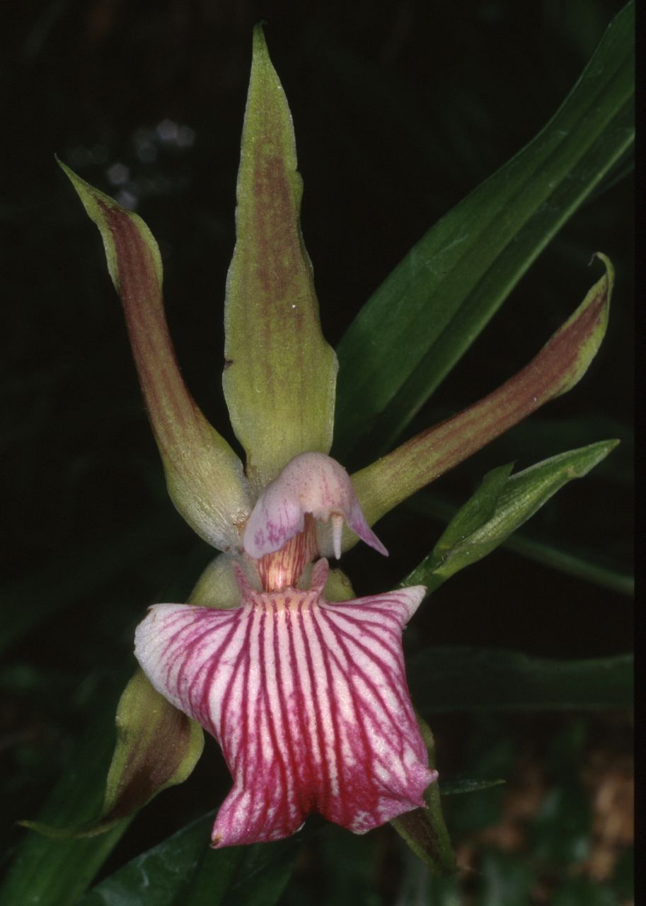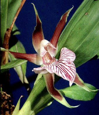 Found in Venezuela, Colombia and Ecuador in rainforests on the eastern slopes of the Andes at elevations of 200 meters as a medium sized, hot growing epiphyte with an elongate woody stem covered in brown sheaths and carrying ellipsoidal, bilaterally compressed, longitudinally grooved pseudobulbs enveloped basally by several imbricate, leaf-bearing sheaths and carrying a single, apical, narrowly elliptic-oblanceolate, acute, shiny green, plicate leaves that blooms on an axillary from the basal sheaths, laxly 2 to several flowered, slender, arching to pendant, to 8" [to 20 cm] long, arcuate inflorescence arising on a newly developing growth with white bracts occuring in the spring and summer.